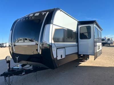 With any Sunset Trailer travel trailer by CrossRoads RV, you will enjoy comfort at every turn! The 5-sided aluminum structure, enclosed underbelly, and HyperDeck flooring provide a durable RV made to last. There is also a power awning with LED lights outdoors, a fiberglass front cap, and a docking station with battery disconnect for easy set-up. Each model includes solid surface kitchen countertops, porcelain toilets, roller shades, and hidden cabinet door hinges to name a few interior comforts!