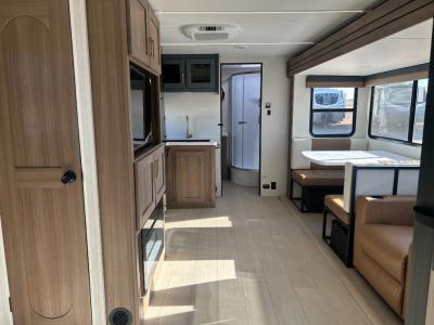 You will love the added interior space you have in this travel trailer thanks to the large slide out in the main living area. Here, you'll enjoy playing cards at the XL booth dinette and relaxing on the tri-fold sofa. Make home-cooked meals on the glass top range or use the exterior camp kitchen. There is even an exterior refrigerator for cold drinks, and the power awning will shade you from the hot summer sun. This model features a full rear bath for added privacy, and the shower skylight will allow natural light in. The front private bedroom includes a king bed, dual wardrobes, plus a shoe storage and pet station for your convenience!