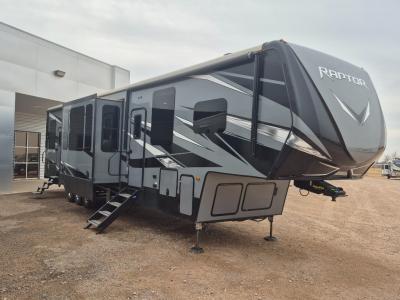 Experience a breath of fresh air with one of these Keystone RV Raptor fifth wheel toy haulers! Their rugged construction consists of a one-piece Alpha Super Flex TPO roof membrane, Dyna Span floor decking, and 5,000 lb. frame-welded tie- downs to keep your toys in place as you travel. Some unexpected conveniences you will appreciate include an Omni-Chill A/C system to keep you cool on those hot summer days, a Furrion backup camera, MaxTurn™ technology with a Helux™ pin box, and a Generation 3 iN-Command smart automation system with Global Connect to make life easier. There is also designer style vinyl flooring throughout, along with new ceiling treatment with LED accent lighting, beach wood and white cabinetry, and many more interior comforts!